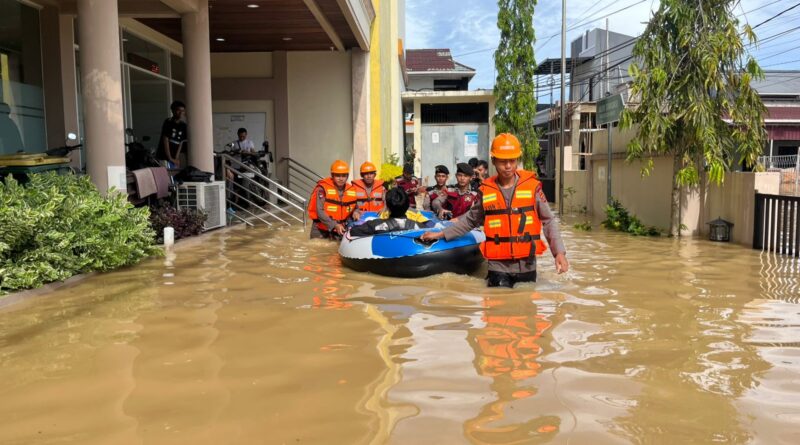TIM RESPONS BENCANA SATBRIMOB POLDA KALTIM EVAKUASI KORBAN BANJIR DI BALIKPAPAN