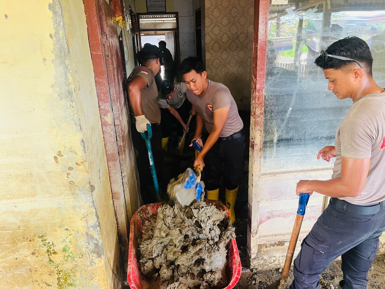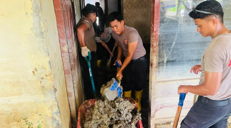 Sinergi di Serambi Mekkah, Personel BKO Brimob Kaltim Bersihkan Lumpur di Asrama Polsek Muara Batu