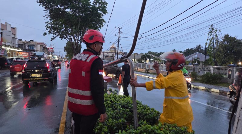 Brimob Evakuasi Cepat Tiang Lampu Jalan Tumbang di Sepinggan Kota Balikpapan