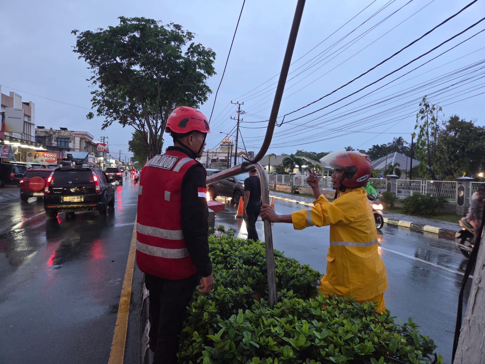 Dalam proses penanganan, petugas Batalyon A Pelopor Satbrimob Polda Kaltim bekerja sama dengan warga sekitar serta pihak PLN Kota Balikpapan untuk evakuasi tiang lampu roboh yang menghalangi jalan.