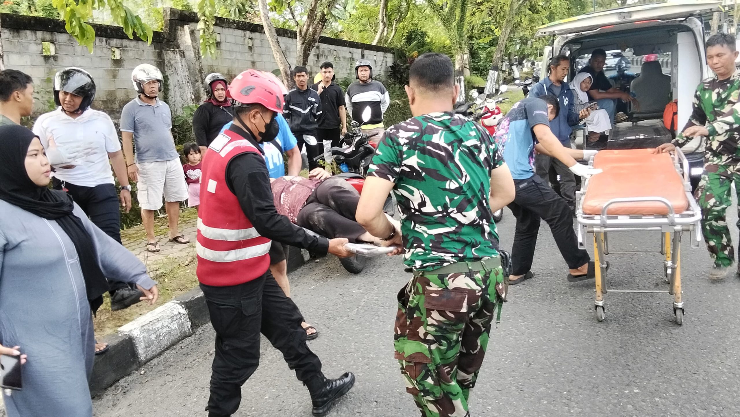 Melihat korban mengalami luka serius, personel segera membantu mengevakuasi korban ke ambulans untuk dibawa ke rumah sakit terdekat.