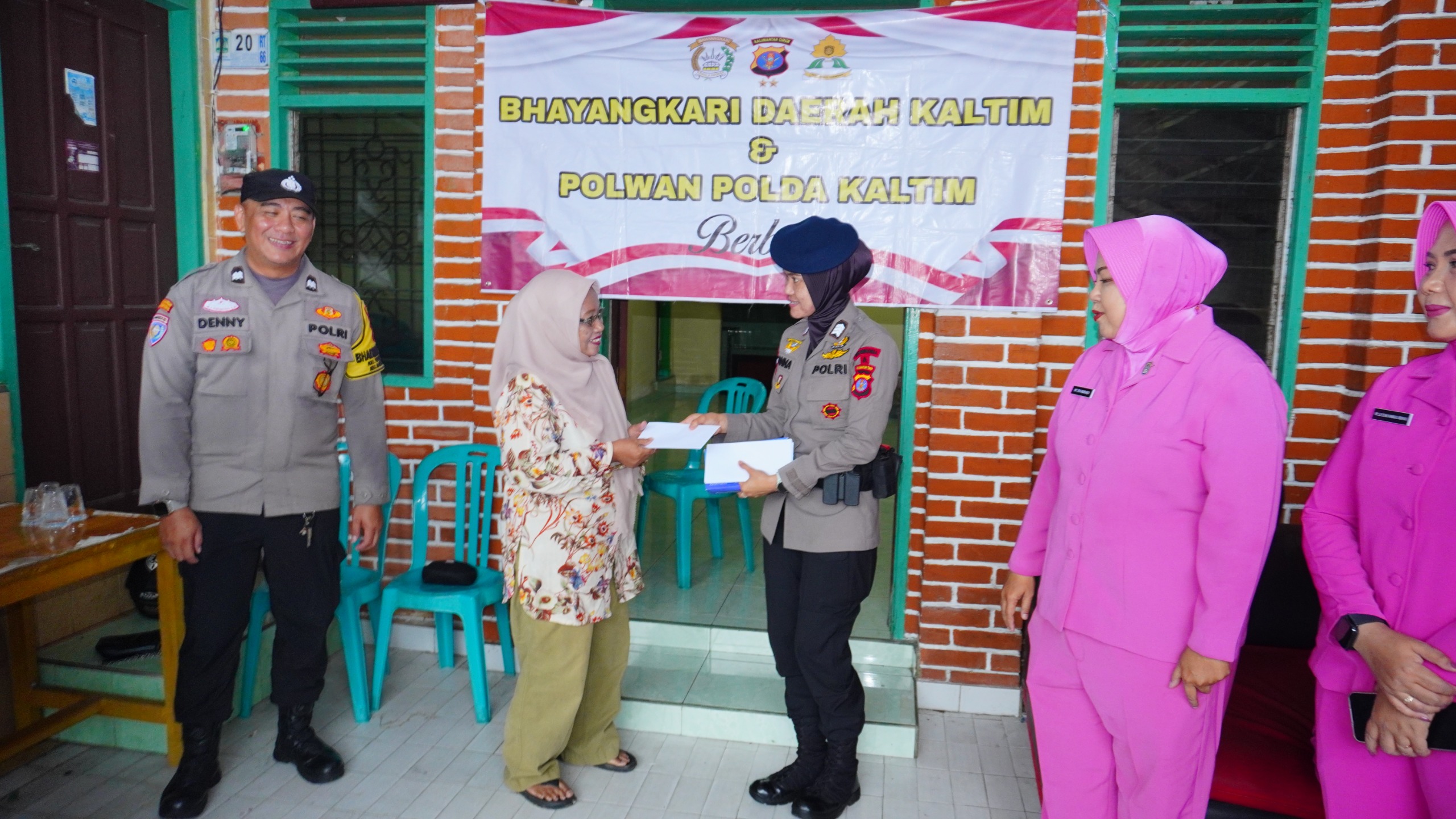 Balikpapan – Personel Polisi Wanita (Polwan) Satbrimob Polda Kaltim bersama Bhayangkari Cabang Satbrimobda Kaltim menggelar aksi kemanusiaan melalui kegiatan bantuan sosial di Kampung Bungas, Kelurahan Gunung Sari Ilir, Kecamatan Balikpapan Kota, pada Kamis (23/04/2026). Dimulai sejak pukul 09.00 WITA, rombongan Polwan dan Ibu-ibu Bhayangkari ini turun langsung menemui masyarakat untuk menyalurkan bantuan tunai kepada 100 warga yang membutuhkan. Kehadiran para personel di tengah pemukiman warga ini disambut hangat oleh masyarakat setempat yang antusias mengikuti jalannya penyerahan bantuan secara tertib dan lancar.